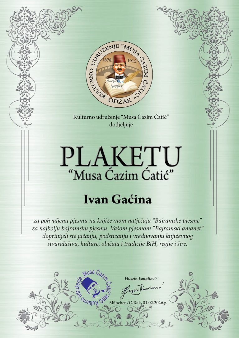 Ivanu Gaćini treća nagrada i pohvala na XI. međunarodnom konkursu „Musa Ćazim Ćatić”