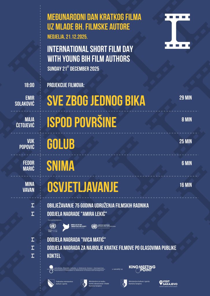 Udruženje filmskih radnika u suradnji s kinom Meeting Point tradicionalno proslavlja Međunarodni dan kratkog filma. Međunarodni dan kratkog filma uz mlade bh. filmske autore u kinu Meeting Point u Sarajevu bit će obilježen u nedjelju, 21.12. u 18:00 sati, uz besplatan ulaz za sve posjetitelje.