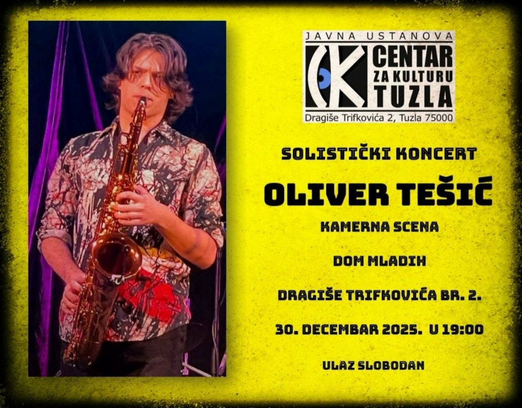Solistički koncert Olivera Tešića na saksofonu, biti će organizovan u utorak, 30.12.2025.godine u 19:00 časova, na Kamernoj sceni Doma mladih Tuzla (Dragiše Trifkovića 2).