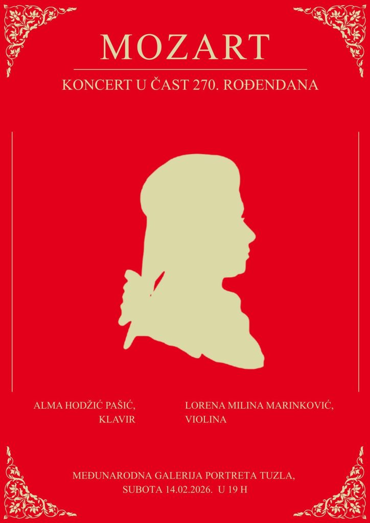 Zadovoljstvo nam je pozvati Vas na koncert klasične muzike, koji će biti održan u subotu, 14. februara 2026. godine u 19:00 sati u Međunarodnoj galeriji portreta Tuzla. Koncert je posvećen obljetnici – 270 godina od rođenja najvećeg kompozitora svih vremena – Wolfgang Amadeus Mozart-a, čija će odabrana djela izvesti uspješne mlade umjetnice – Alma Hodžić Pašić (klavir) i Lorena Milina Marinković (violina).