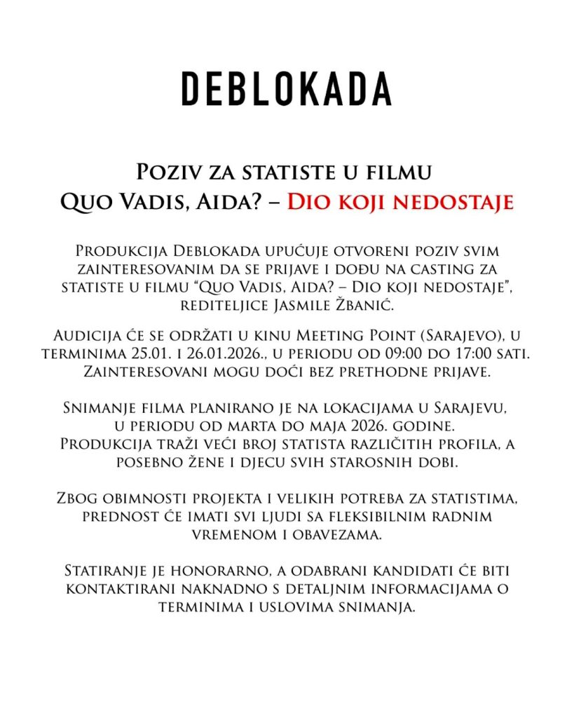 Film Poziv za statiste u filmu “Quo Vadis, Aida? – Dio koji nedostaje”, rediteljice Jasmile Žbanić. 20.01.2026 20:18 kultura.ba Produkcijska kuća “DEBLOKADA” otvorila je poziv za statiste u filmu “Quo Vadis, Aida? – Dio koji nedostaje”, rediteljice Jasmile Žbanić. Pozivamo sve zainteresovane da dođu na casting za statiste u navedenim terminima.