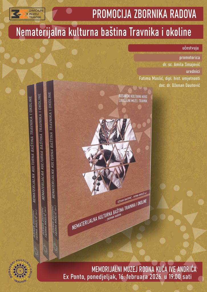 U ponedjeljak, 16. 2. 2026. godine, UG Bosanski kulturni krug i JU Zavičajni muzej Travnik priređuju promociju zajedničkog izdanja Zbornik radova Nematerijalna kulturna baština Travnika i okoline. U ulozi promotora bit će dr. Amila Smajović, a publici će se obratiti i urednici Zbornika Fatima Maslić, direktorica Zavičajnog muzeja, i doc. dr. Dženan Dautović, predsjednik UO BKK.