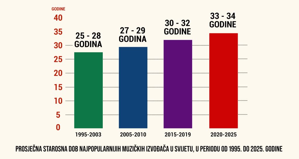 Podaci jasno pokazuju da se u posljednjih 30 godina dramatično promijenila prosječna dob najpopularnijih izvođača, i to u korist starijih, već afirmisanih imena.